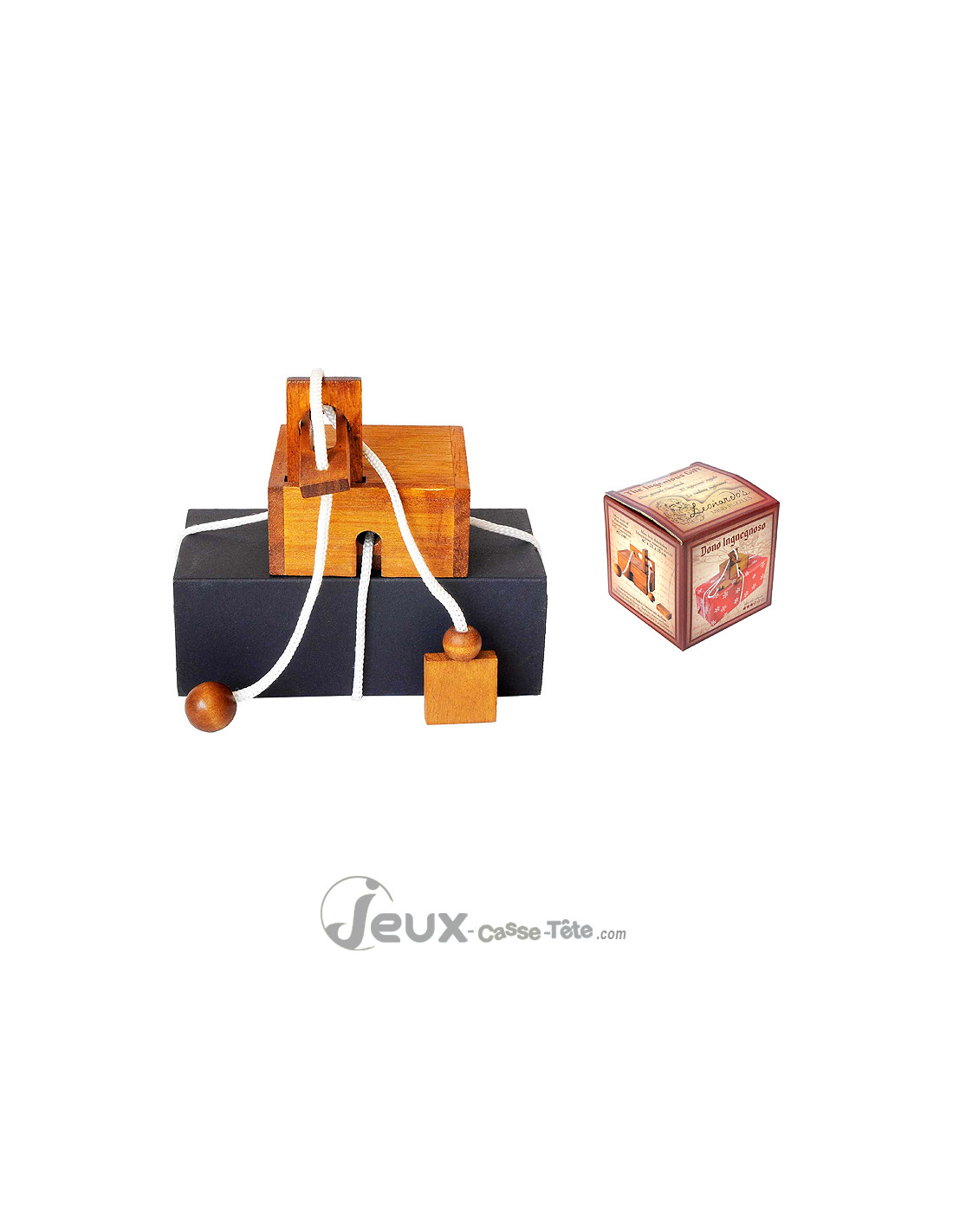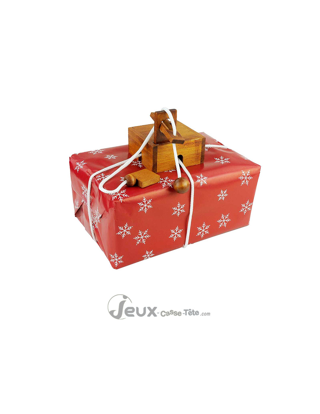 Ce casse-tête élégant met au défi votre logique et votre patience grâce à un mécanisme astucieux qui consiste à libérer un cadeau à l’aide d’un système de cordes et de pièces en bois.