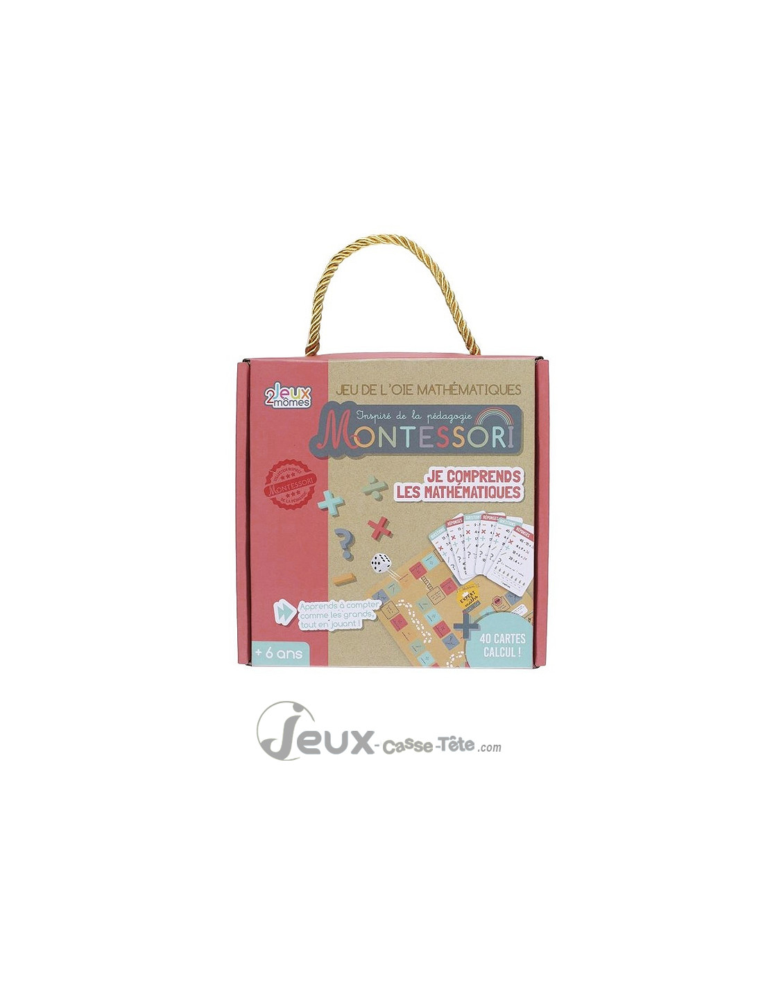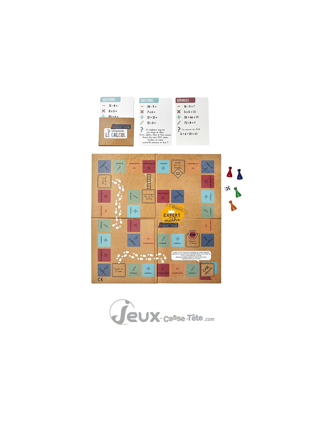 Contenu : 1 plateau de jeu type jeu de l’oie, 40 cartes de calcul, 1 dé, pions de jeu.